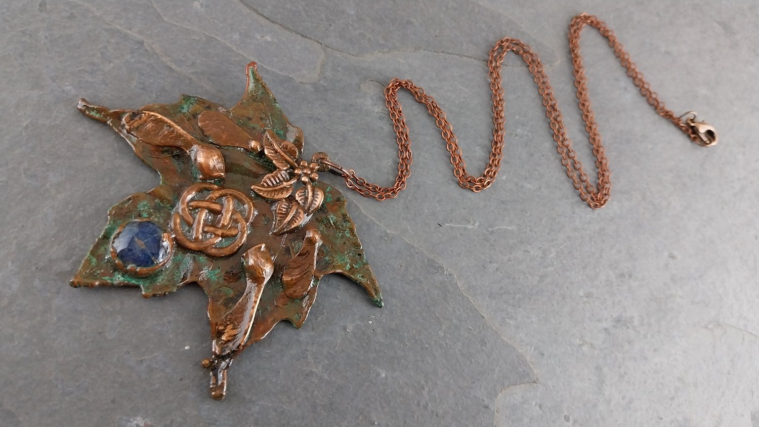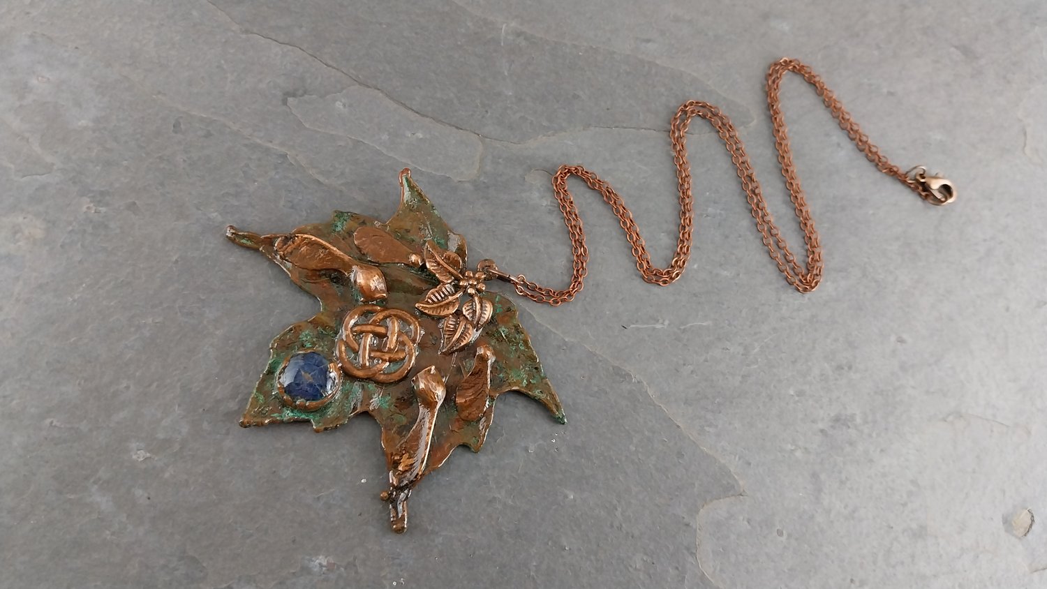 Item - Maple leaf pendant with a Celtic knot charm, a lapis lazuli cabochon and two maple seeds.