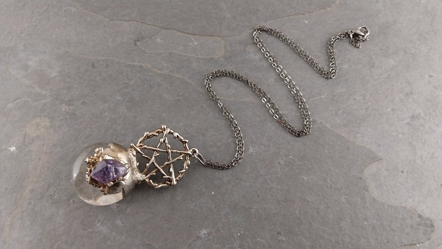 Item - Tumbled clear quartz crystal with a pentacle charm and a natural amethyst point companion