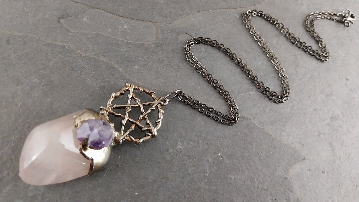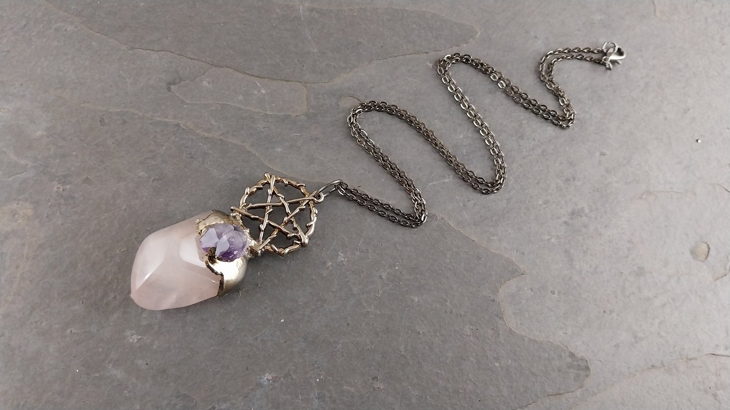Item - Tumbled rose quartz crystal with a pentacle charm and a natural amethyst point.